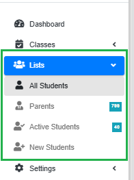 Step 1 - Access the Student List. Under the List menu, click on Active Students or All Students.