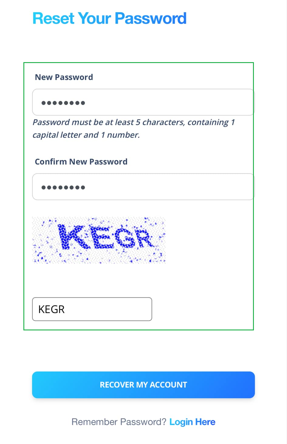 Enter your new password and complete the Captcha.