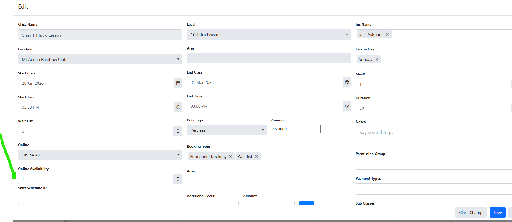 Using the edit class feature you can update online availability.