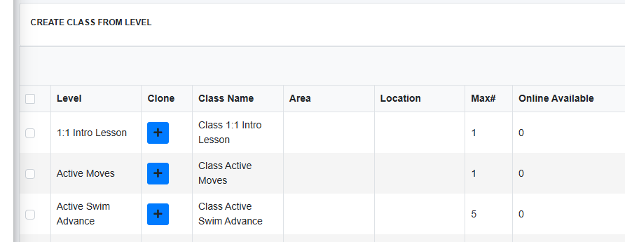 If you have your pre-sets set, this will be pre-filled with your default online availability for the selected level. If you wish to put a different value for the class you are building simply update the number before saving and creating the class.